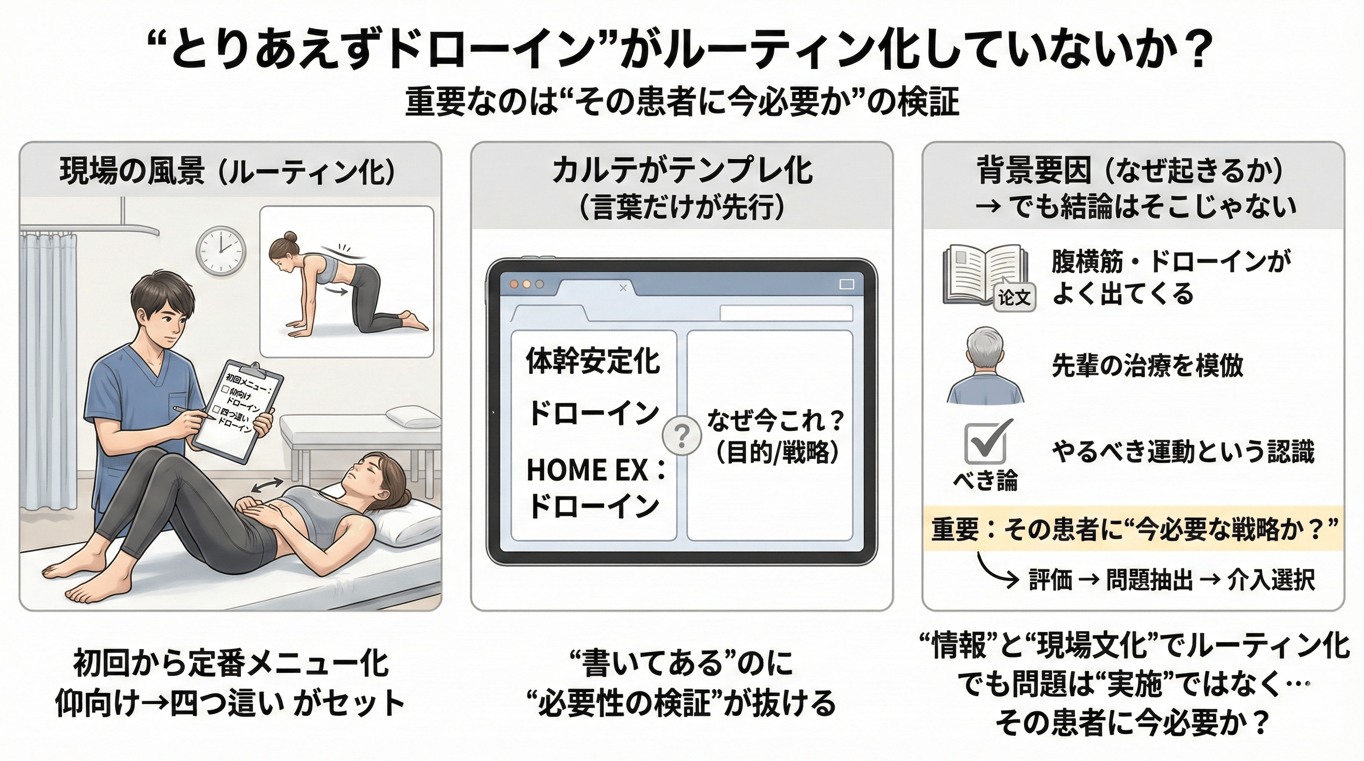 「とりあえずドローイン」ルーティンが、自分の臨床にも染みついていないのかということです。カルテの記載には「体幹安定化」や「ドローイン」という項目がテンプレのように並ぶ一方で、「その患者にとって、いま本当に必要な戦略か?」ということが重要です。