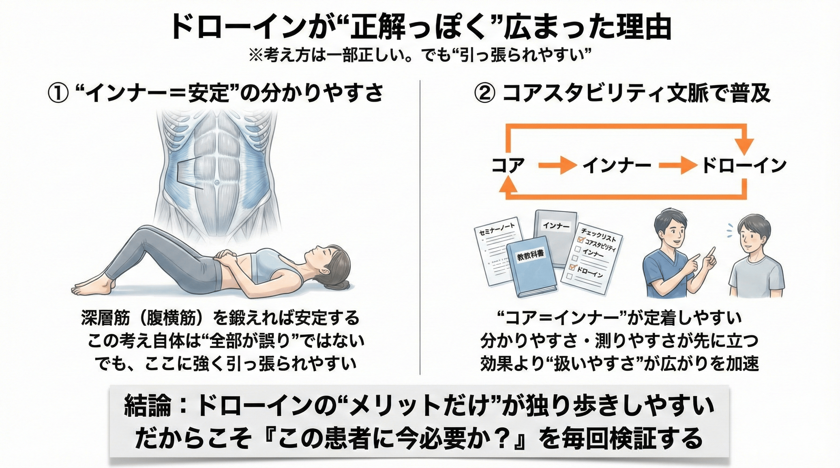 ドローインが広まった背景は、分かりやすさと測りやすさが先に立った結果であって、ドローイン自体の効果やメリットだけが臨床に広がっている可能性があるということです。
