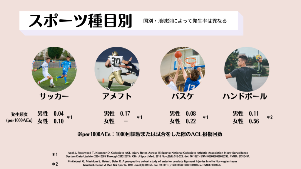 スポーツ種目別のACL損傷の発生率は、調査した国によっても異なりますし、地域別によっても変わるものになります。