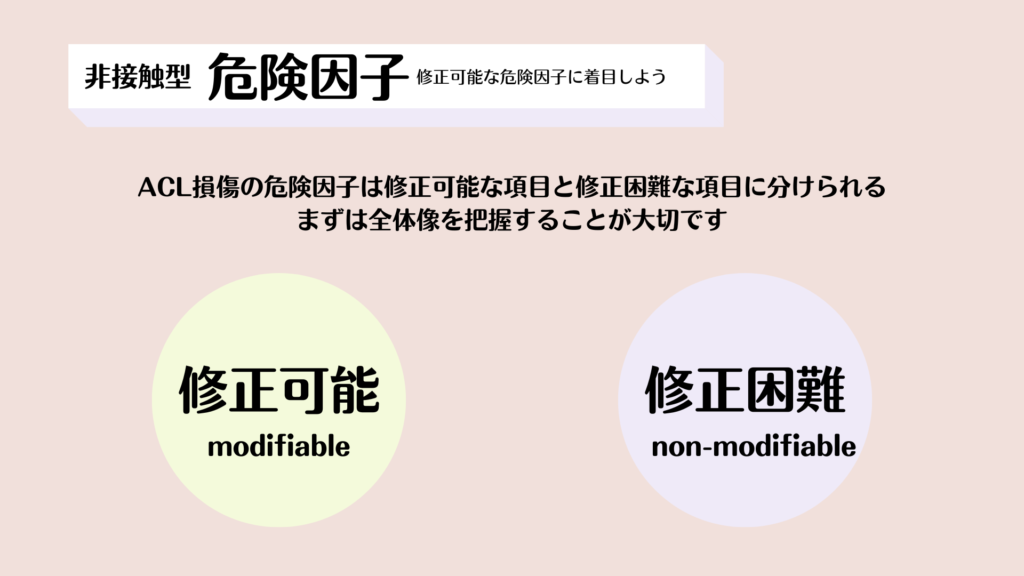 これは、〇〇があると損傷しやすい、〇〇があると損傷しにくいと言ったように危険因子を把握しておくことで、リハビリにおける運動療法の介入が必要になってきます。