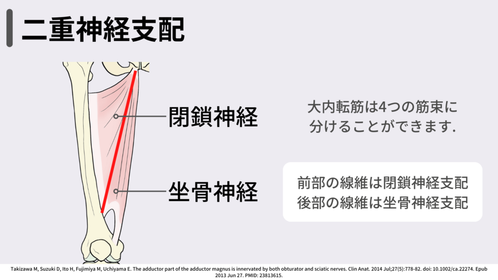 起始自体が前方の恥骨・後方の坐骨結節、付着するのが内転筋結節であるため、大内転筋前部線維と大内転筋後部線維に分けることができます。