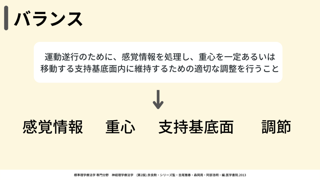 バランスとは重心を支持基底面内に維持することになります。難しい定義の中で、重要な項目は上記の4つになります。
