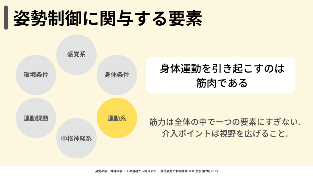 姿勢制御に関与する項目は、数多くあります。この運動系に当てはまる部分には筋力が入りますが、バランス能力と筋力の関係性は、あくまで一つの要素にすぎません。