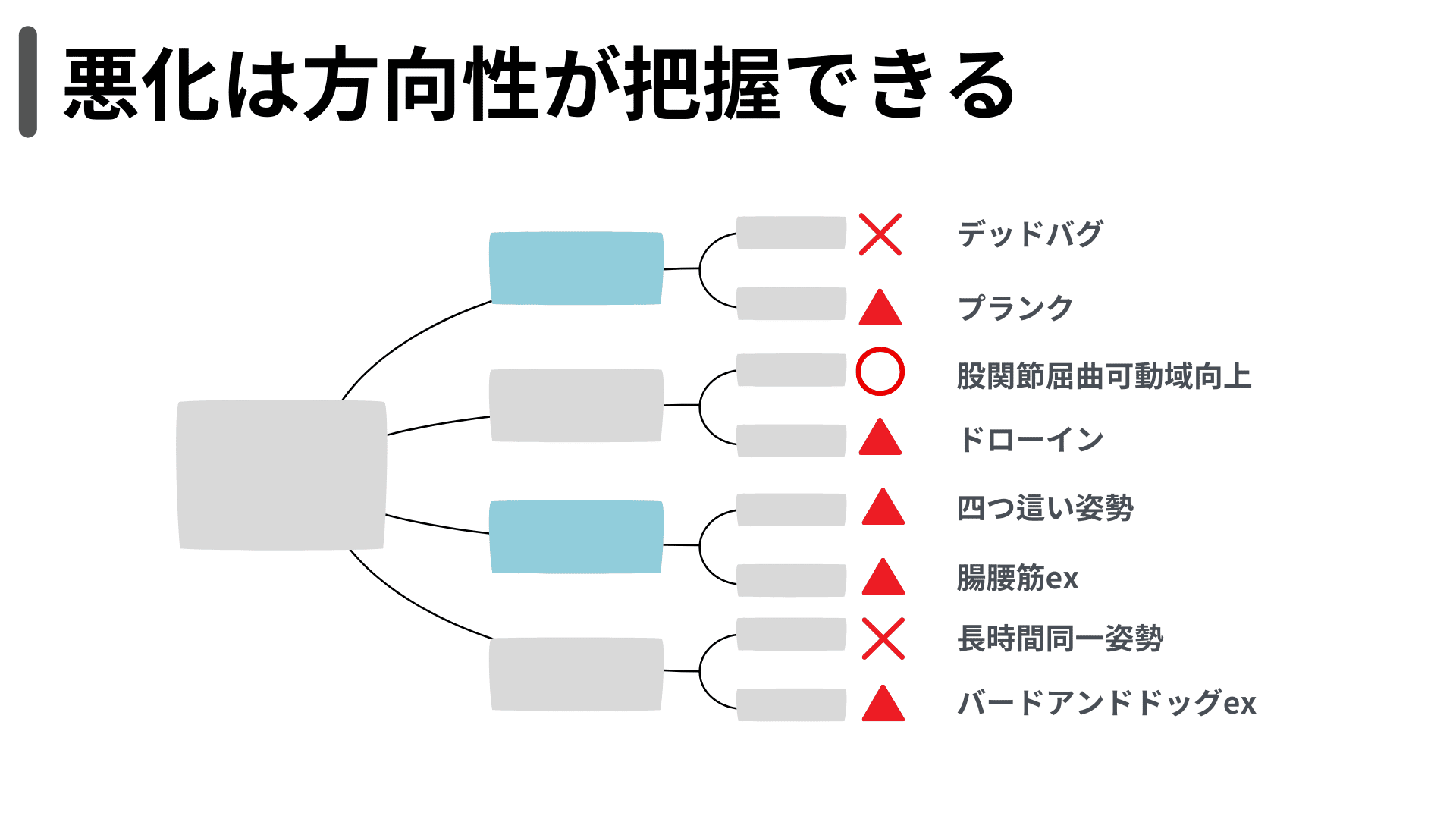 悪化した場合や運動療法が効かない場合は、まず一つ前に戻ってください。