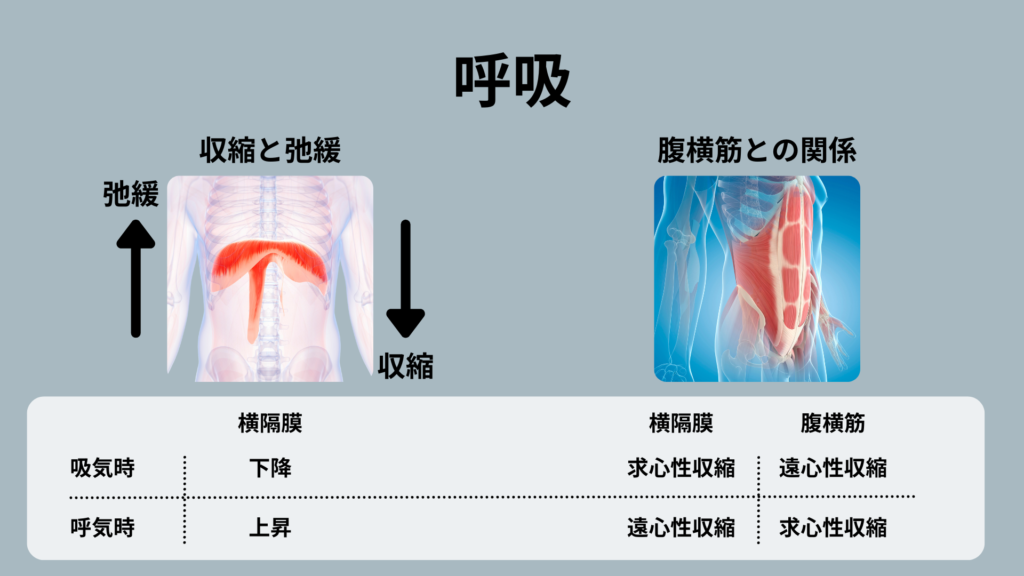 腹横筋は、吸気時には遠心性収縮をしていて、呼気時に求心性収縮になります。