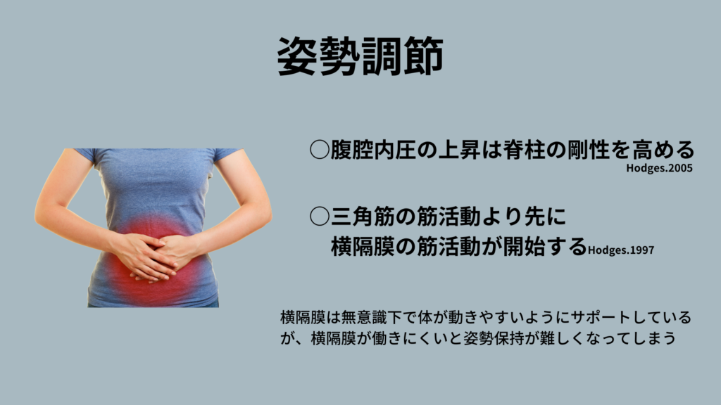 横隔膜が上下移動することで、腹圧が高まり、無意識的に身体を動きやすくかつバランスが保てるように働きます。