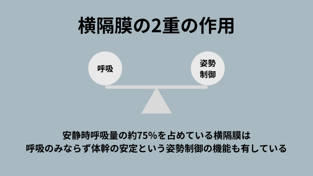横隔膜は安静時呼吸量の75%を占めていると言われていて、呼吸における重要性がわかると思います。