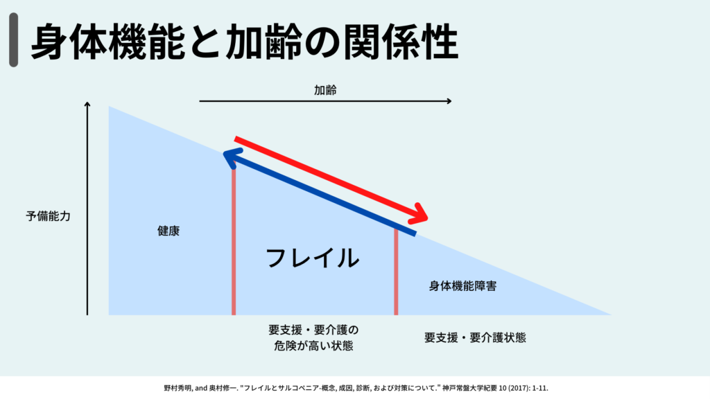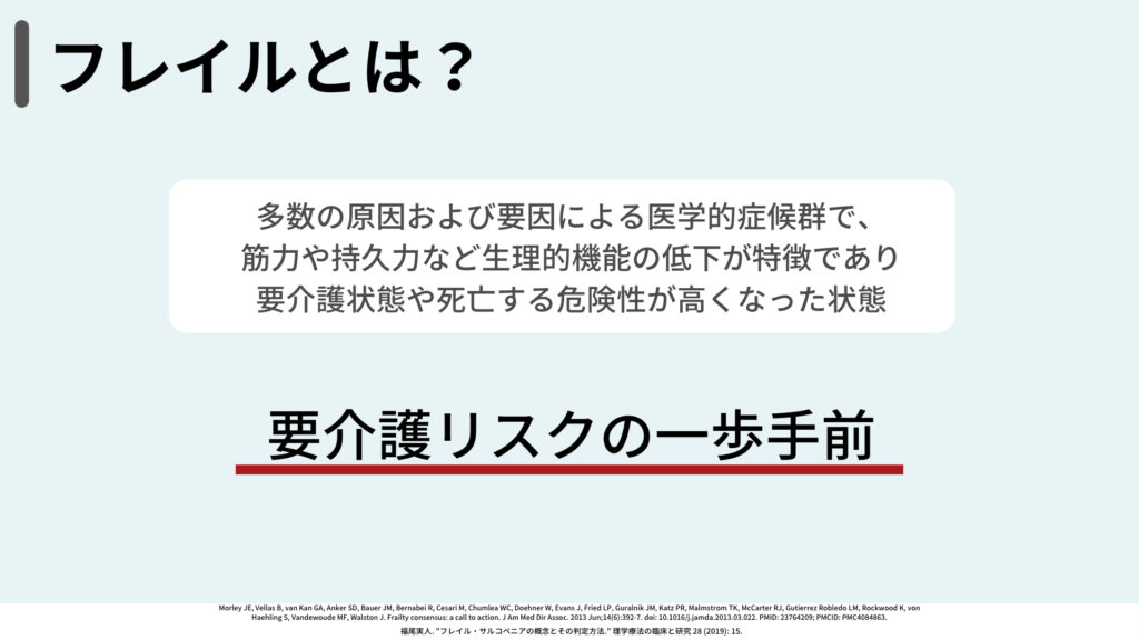フレイルというのは、もともと「か弱さ」という意味があると言われています。筋力や持久力などの機能低下があり、要介護状態や死亡する危険性が高くなっている状態を指します。