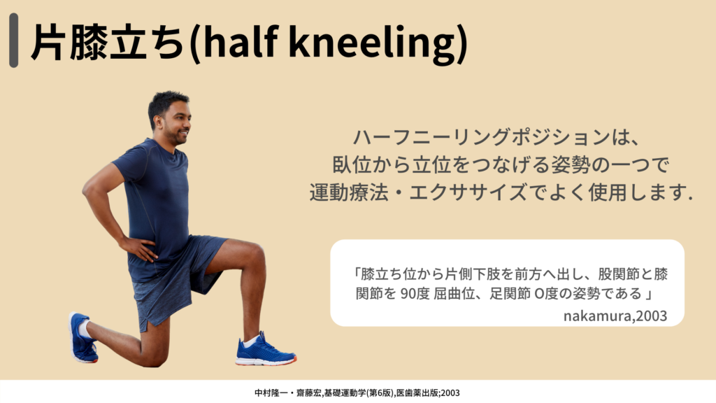 まず片膝たちのポジション自体の定義を見ていくと、股関節・膝関節屈曲90°、足関節中間位の姿勢のことを指しています。