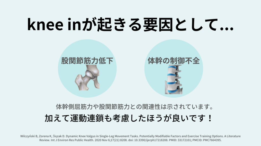 筋力低下や機能低下があると、knee inがしやすくなります。