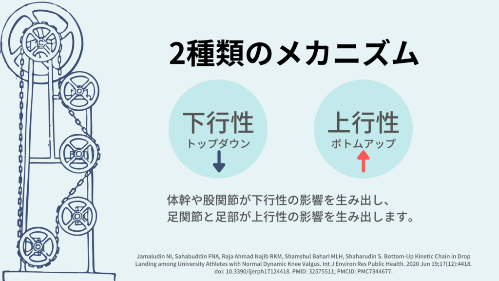 先ほどの股関節筋力低下や体幹の運動制御不全は下行性運動連鎖になります。