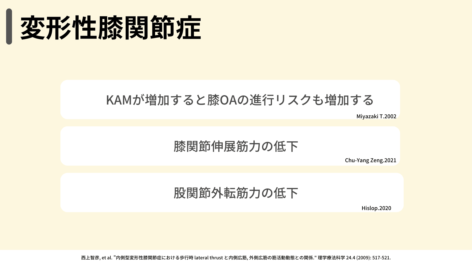 健常者と比較して膝OA患者は、膝関節伸展筋力と股関節外転筋力が低下していると言われていますが、これを聞くだけでも先ほどのパテラセッティングや股関節外転運動を行う理由になると思います。