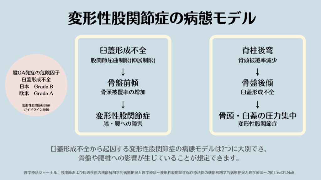 変形性股関節症は、大腿骨の被覆率を代償するようにした結果から股関節の変形が生じることがあります。そのあたりは、骨盤が前傾しているため腰椎伸展が過剰になるケースが多いので、腰痛が生じないように注意しましょう。